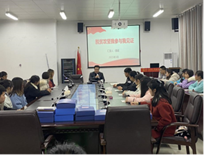 合唱红歌后,晏超同志为在场的师生作了题为《脱贫攻坚我亲历我见证》的“开学第一课”报告。报告以习近平总书记在全国脱贫攻坚总结表彰大会上的讲话为序,围绕习总书记的讲话精神、脱贫攻坚我亲历、脱贫攻坚我见证、乡村振兴与脱贫攻坚的衔接四个方面展开。结合他2013年1月至12月在贵州省黄平县重安镇金台村参加同步小康党建扶贫工作的亲身经历与公司选派的驻村第一书记饶义军博士的先进事迹,对我国脱贫攻坚伟大壮举的历史意义、现实意义、宝贵经验、攻坚历程等方面进行了现身说法,为同学们上了一堂生动、别致又真切的报告。
